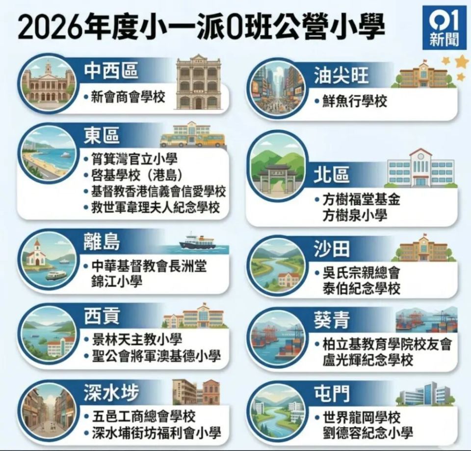 中西区的新会商会学校;西贡区的景林天主教小学、圣公会将军澳基德小学; 离岛区的中华基督教会长洲堂锦江小学;油尖旺区鲜鱼行学校;屯门区的世界龙冈学校刘德容纪念小学;